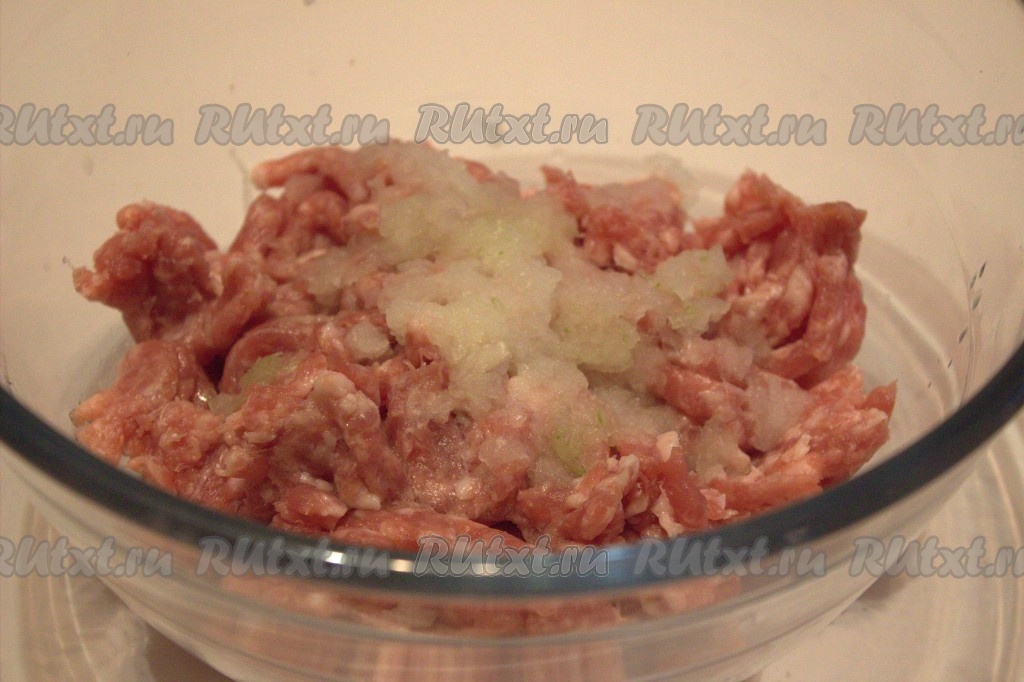 Фарш, купленный в магазине или получившийся после прокручивания мяса через мясорубку, выложить в достаточно объёмную миску, добавить к нему луковицу, натёртую на мелкой тёрке (можно лук перекрутить через мясорубку или нарезать на мелкие кубики).