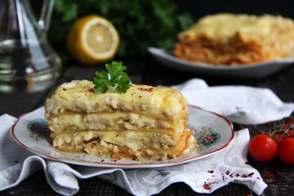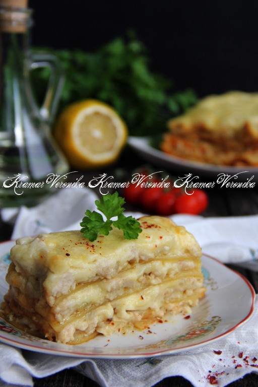 Недавно купила в магазине листы для лазаньи и решила приготовить это вкусное блюдо. Лазанья с фаршем из готовых (покупных) листов получается очень аппетитной, вкусной, сочной и сытной. Я сформировала лазанью в форме для выпекания кекса. Она получилась слоистой и высокой, но, в принципе, лазанью можно сформировать в любой жаропрочной форме, подходящей по размеру.