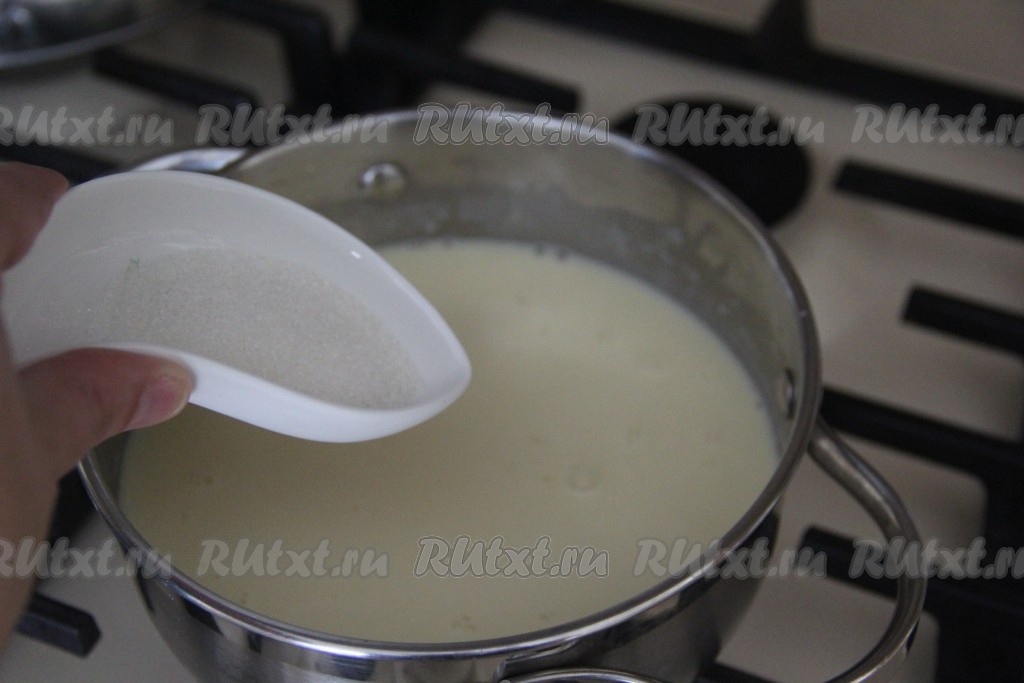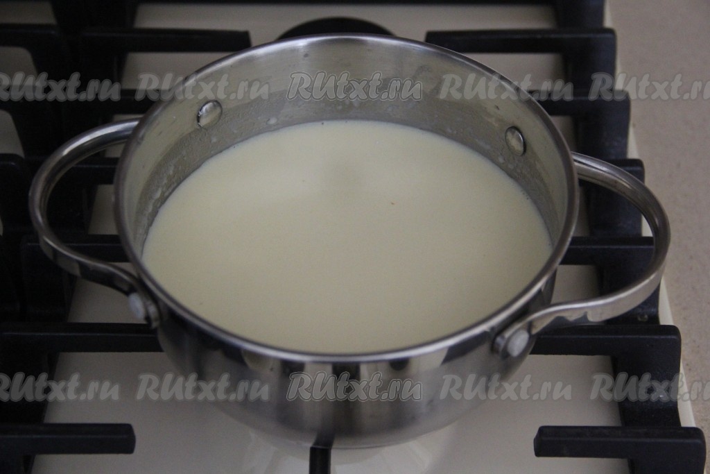 Добавить в соус бешамель соль и сахар, довести до кипения, а затем проварить на небольшом огне, помешивая, 3-5 минут, после этого снять с огня и дать немного остыть.