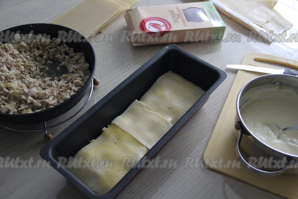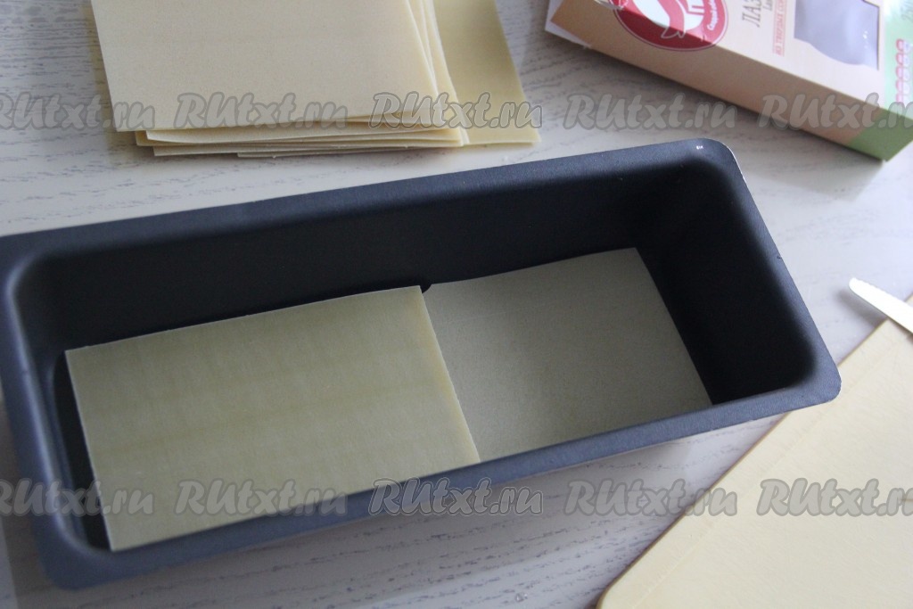 Перед тем как формировать лазанью, внимательно ознакомьтесь с инструкцией на упаковке листов для лазаньи. Некоторые листы требуется предварительно отваривать в кипящей воде до полуготовности. Я использовала листы для лазаньи, которые не нужно предварительно отваривать. На дно жаропрочной формы выложить несколько листов для лазаньи. Листы нужно выкладывать в один слой, заполняя дно формы.