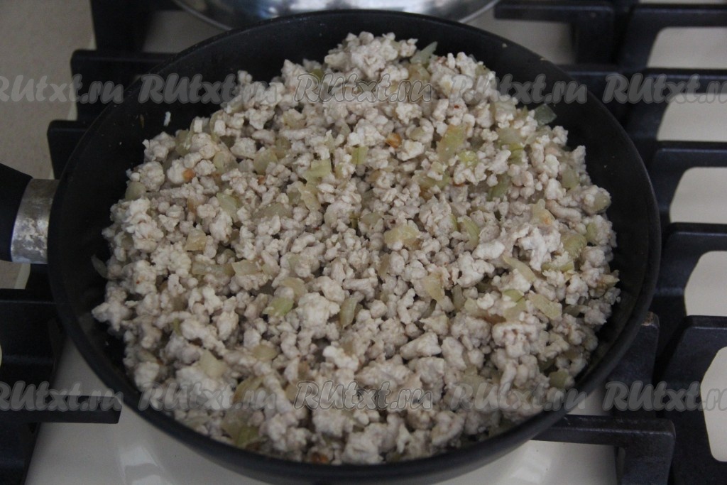 Обжаривать фарш с луком минут 15, разбивая мясные комочки, на среднем огне, посолить, добавить специи по вкусу, снять с огня и дать фаршу немного остыть.