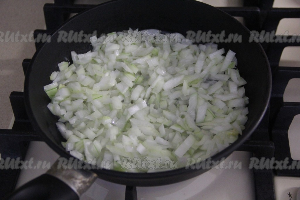 Теперь займёмся мясной начинкой для лазаньи, для этого очищенную и мелко нарезанную луковицу нужно обжарить на растительном масле на среднем огне до прозрачности (на это потребуется 4-5 минут), не забывая помешивать.