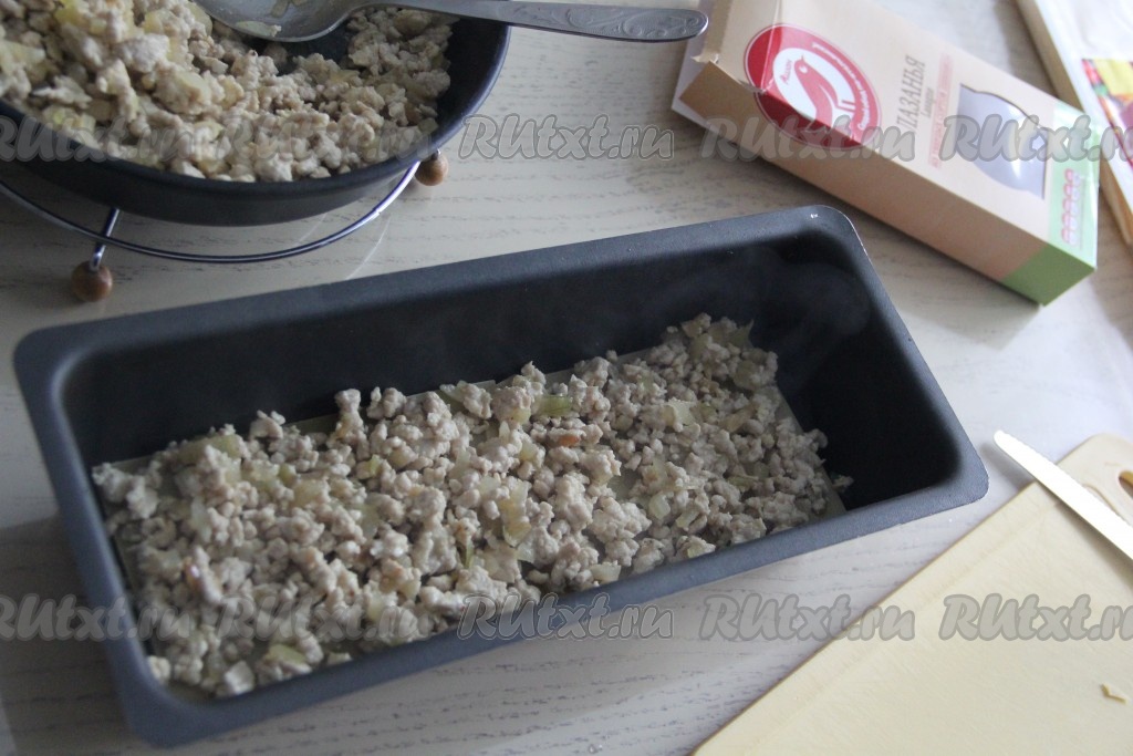Поверх листов выложить часть фарша и разровнять.