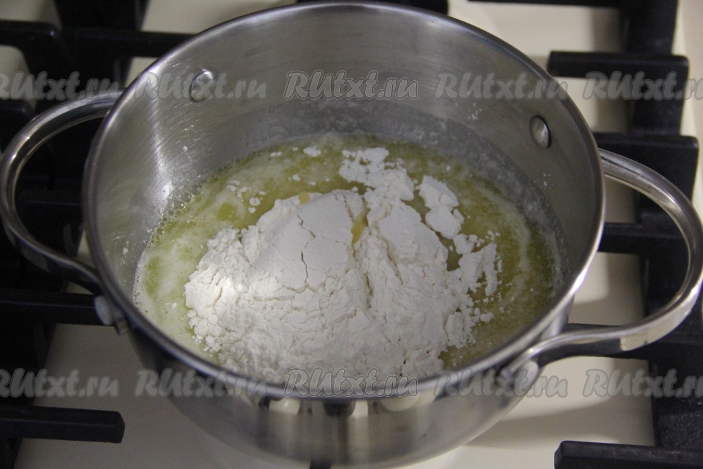 Как только масло полностью растопится, всыпать муку.