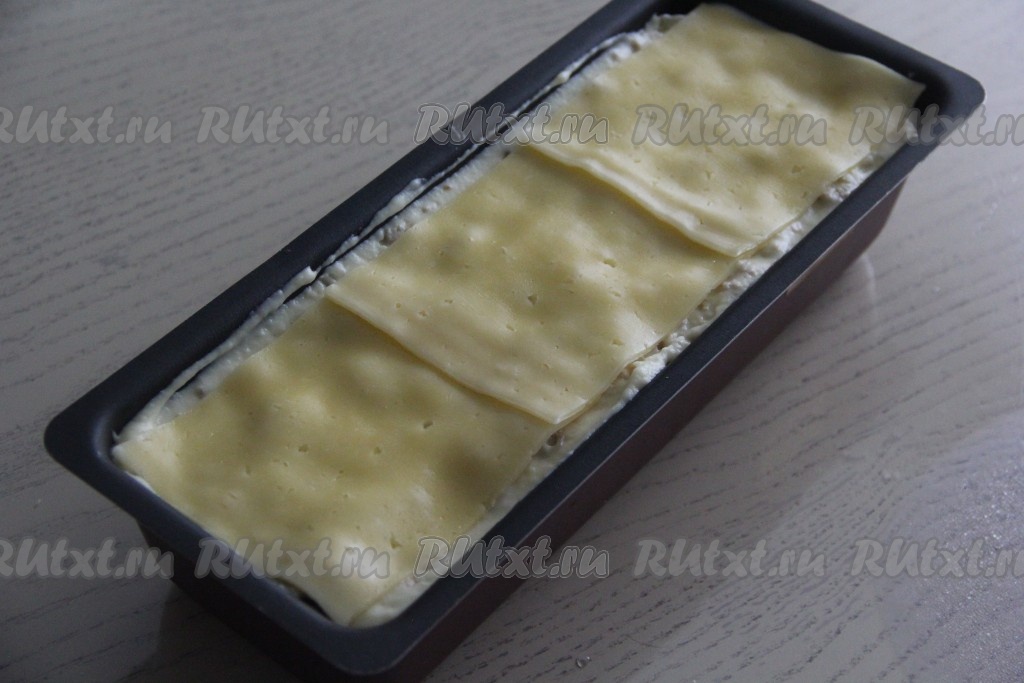 Поверх соуса разложить тонкие пластинки сыра (или натёртый сыр).