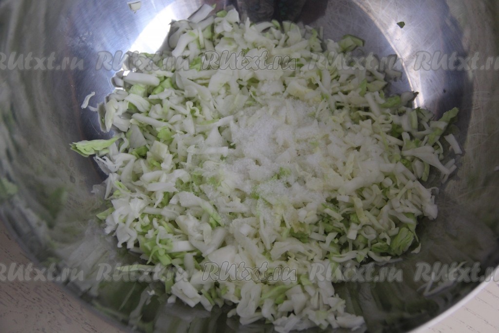 Капусту мелко нарезать, выложить в достаточно объёмную миску, добавить лук и соль.
