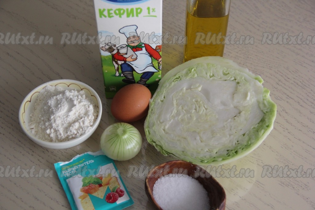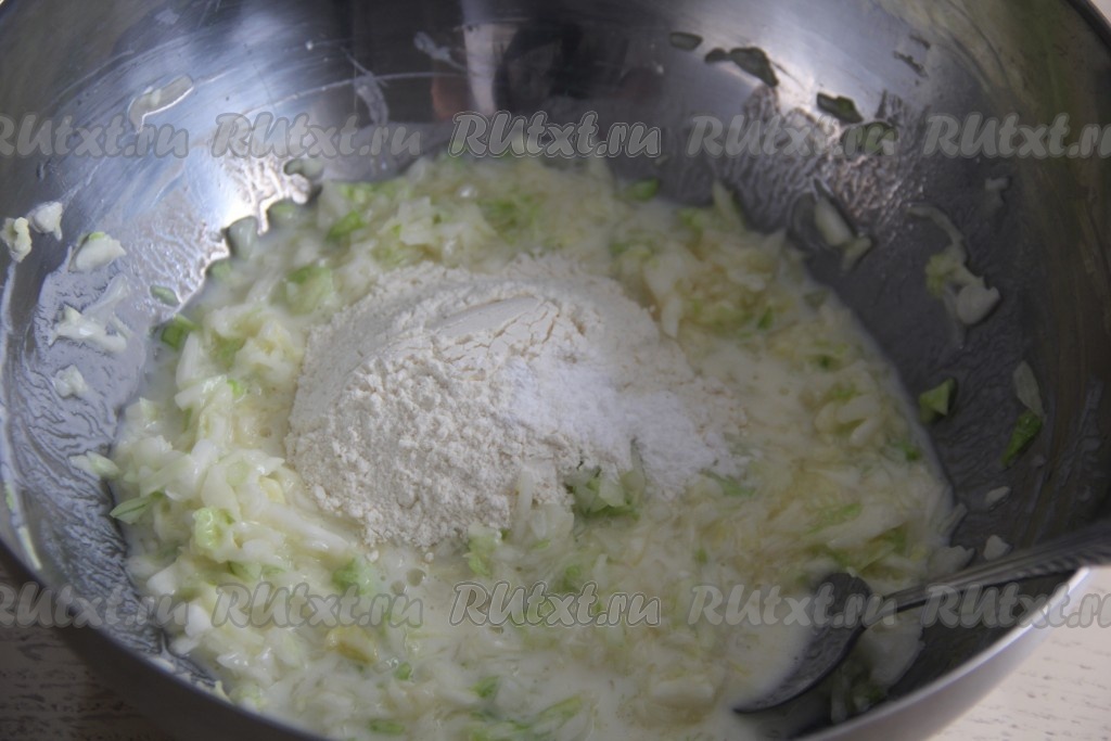 Перемешать капустно-кефирную массу, всыпать разрыхлитель и половину муки, перемешать. Затем муку добавлять постепенно, каждый раз очень хорошо перемешивая.