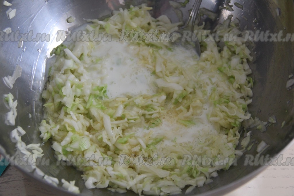 Перемешать капусту с яйцом, затем влить кефир.