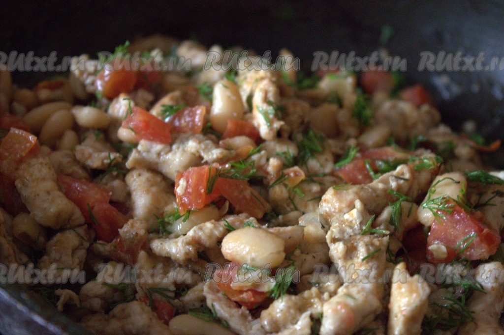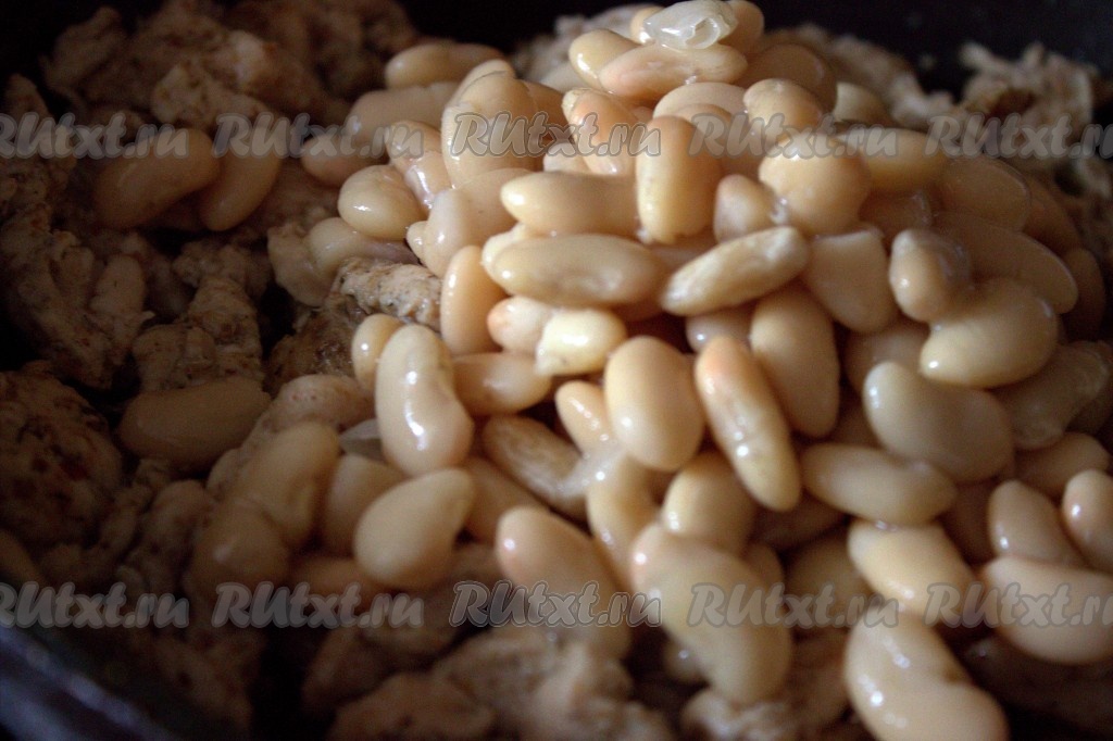 Затем с консервированной фасоли слить жидкость, добавить её в сковороду с обжаренными кусочками куриного мяса и перемешать.