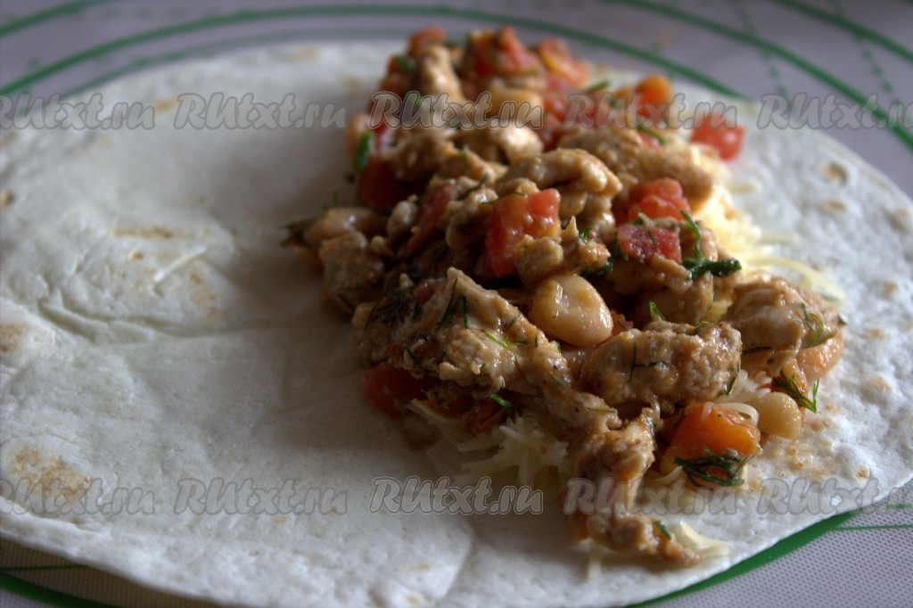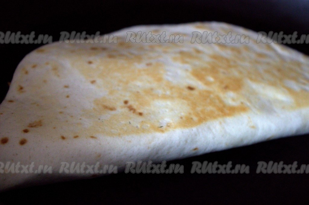 Чистым краем тортильи накрыть край с начинкой, складывая тортилью пополам, затем слегка прижать рукой.