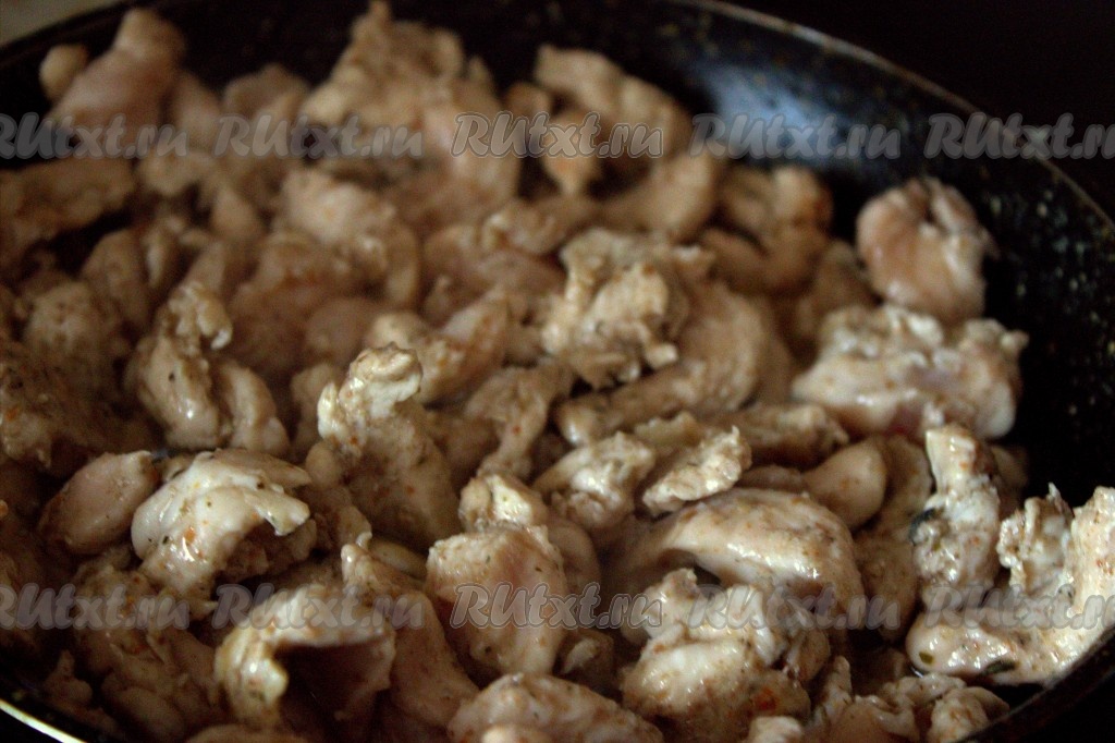 В сковороду, хорошо разогретую с растительным маслом, выложить полоски куриного филе и обжарить на среднем огне, помешивая, в течение 7-10 минут.