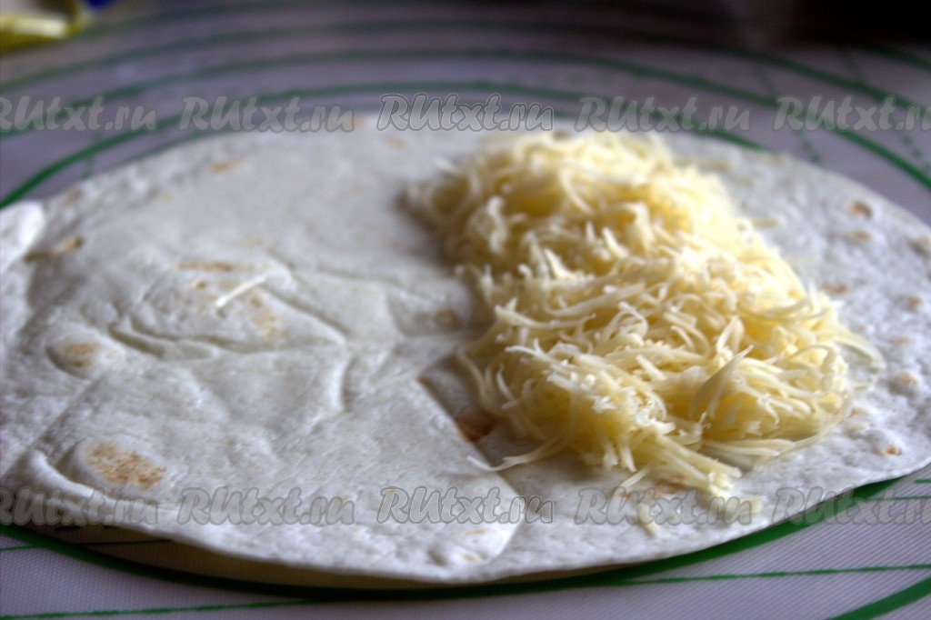 На одну половину тортильи, немного отступив от края, выложить часть сыра, натёртого на средней (или мелкой) тёрке.