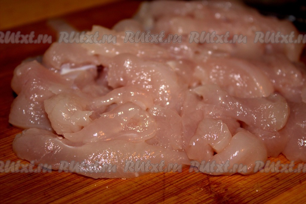 Куриное филе вымыть, нарезать на небольшие полоски.