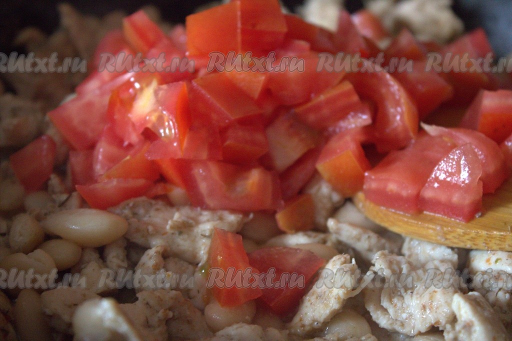 Далее в сковороду к куриному мясу и фасоли добавить помидор, нарезанный небольшими кубиками, перемешать.