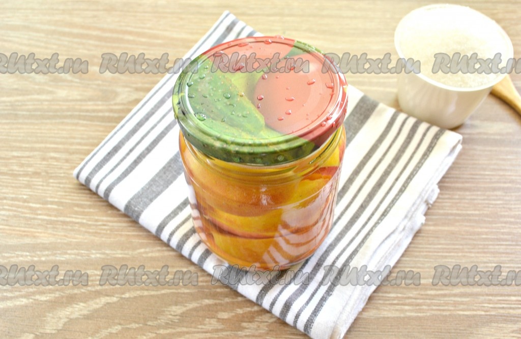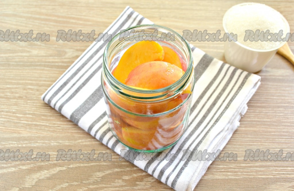 Заполнить банку дольками нектаринов. Старайтесь заполнить баночку плотно, но в тоже время не переусердствуйте, чтобы не помять фрукты.
