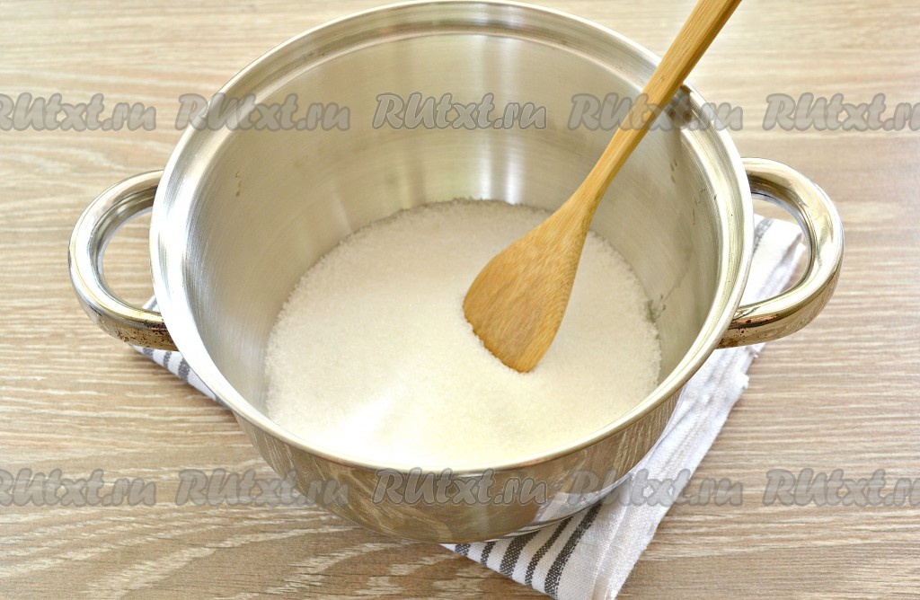 По прошествии этого времени насыпать в кастрюлю сахар. В кастрюлю с сахаром вылить всю воду, которая была в банке с нектаринами, поставить на средний огонь, при постоянном помешивании довести до кипения, а затем проварить сироп минуты 2-3 (весь сахар должен раствориться). Пока варится сироп, банку с нектаринами лучше прикрыть крышкой.