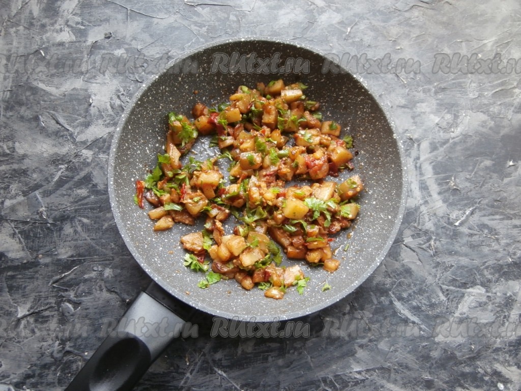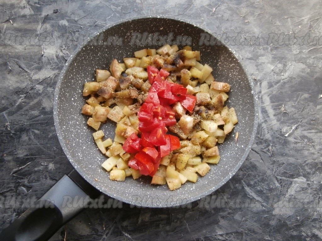 Обжарить баклажан, помешивая, на среднем огне минут 5-6, добавить соль, перец, майоран и специи. Также добавить нарезанный небольшими кусочками свежий помидор.