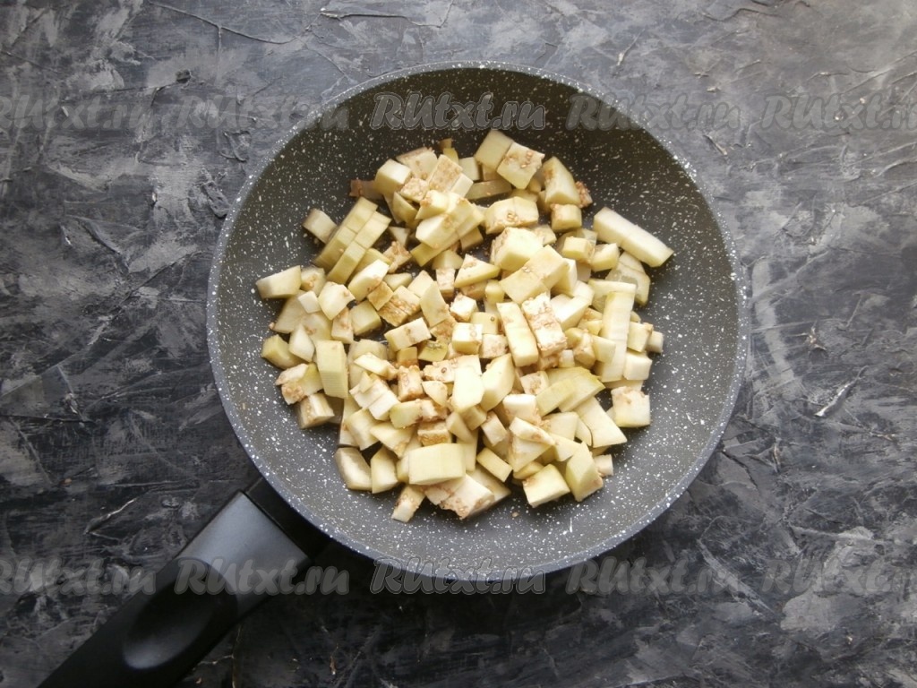 Баклажан очистить от кожуры, нарезать небольшими кубиками, выложить в сковороду с растительным маслом.