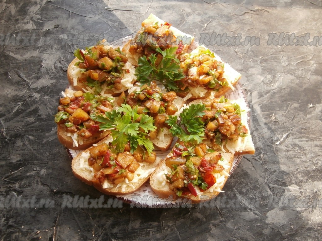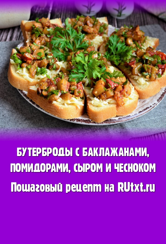 Очень вкусные бутерброды, приготовленные с баклажанами, помидорами, сыром и чесноком, можно сразу подавать к столу.