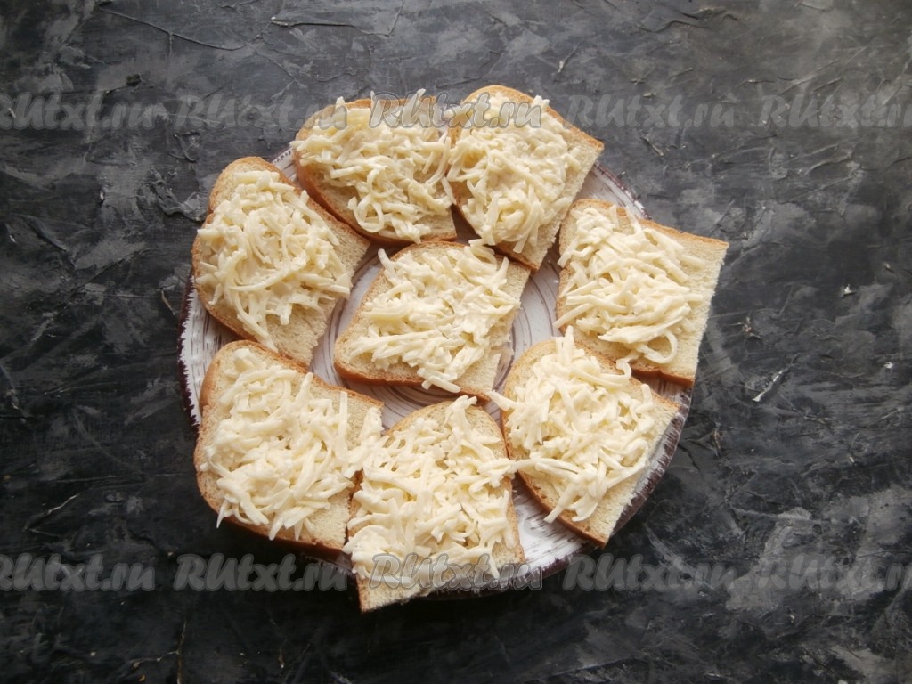 Ломти батона разрезать на 2 части, выложить на тарелку, смазать ломтики получившейся сырной массой.