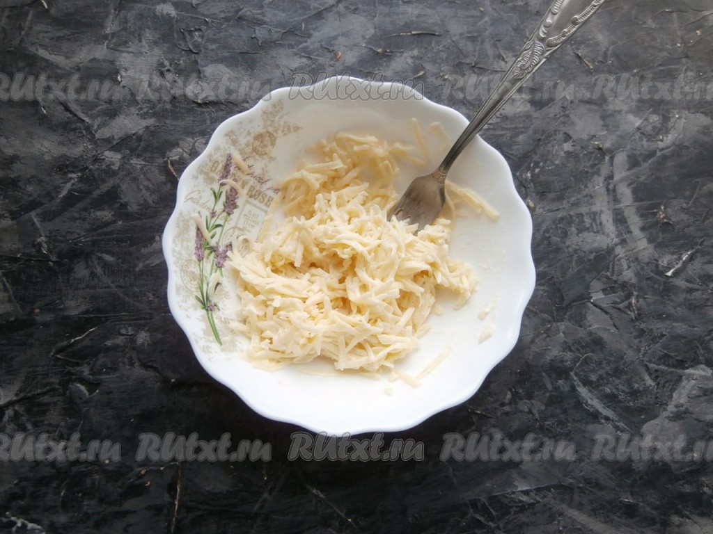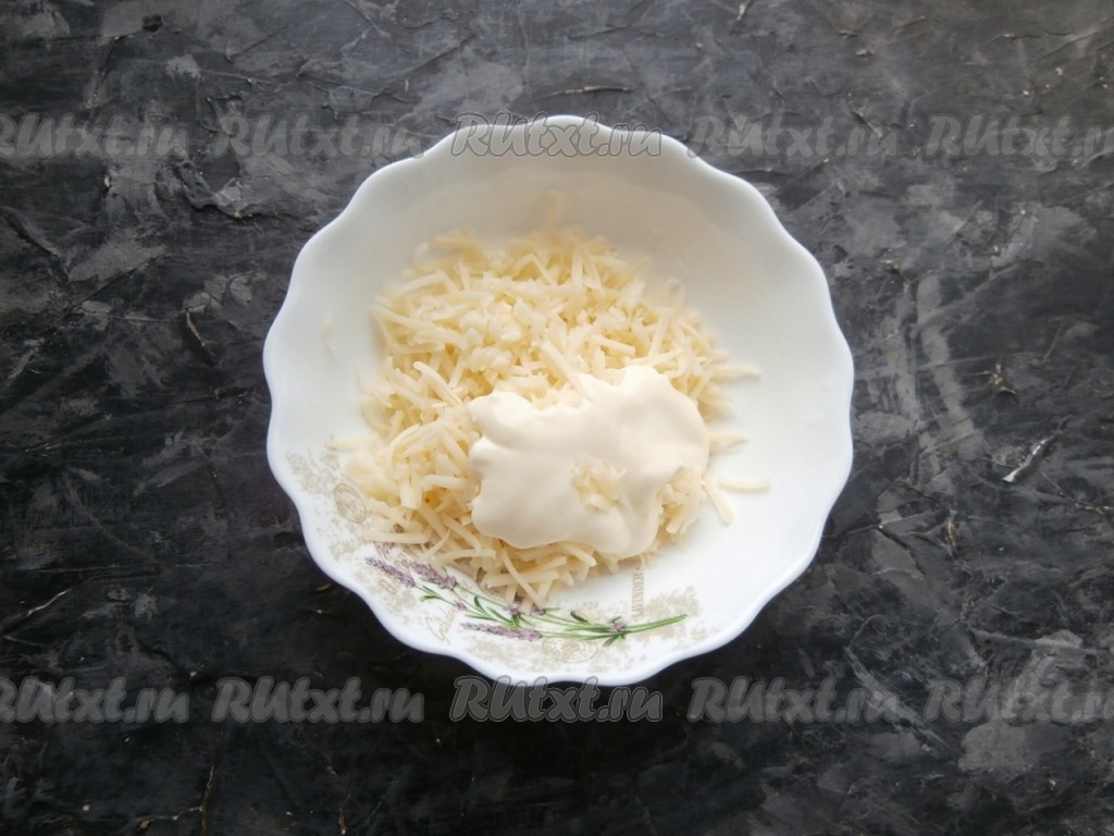 Сыр натереть на средней терке в отдельную миску, добавить измельчённый чеснок и майонез.