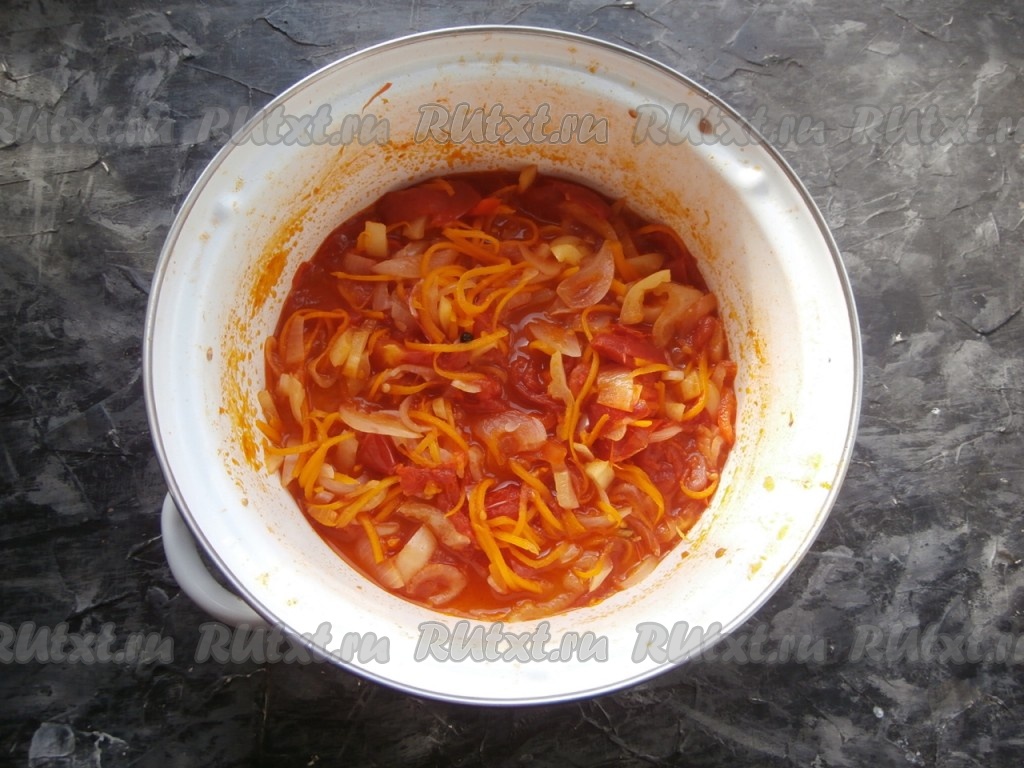 Далее кастрюлю с овощами поставить на средний огонь, довести содержимое, иногда помешивая, до кипения и варить салат на медленном огне под прикрытой крышкой 30 минут.