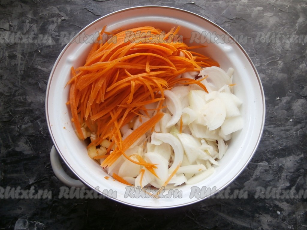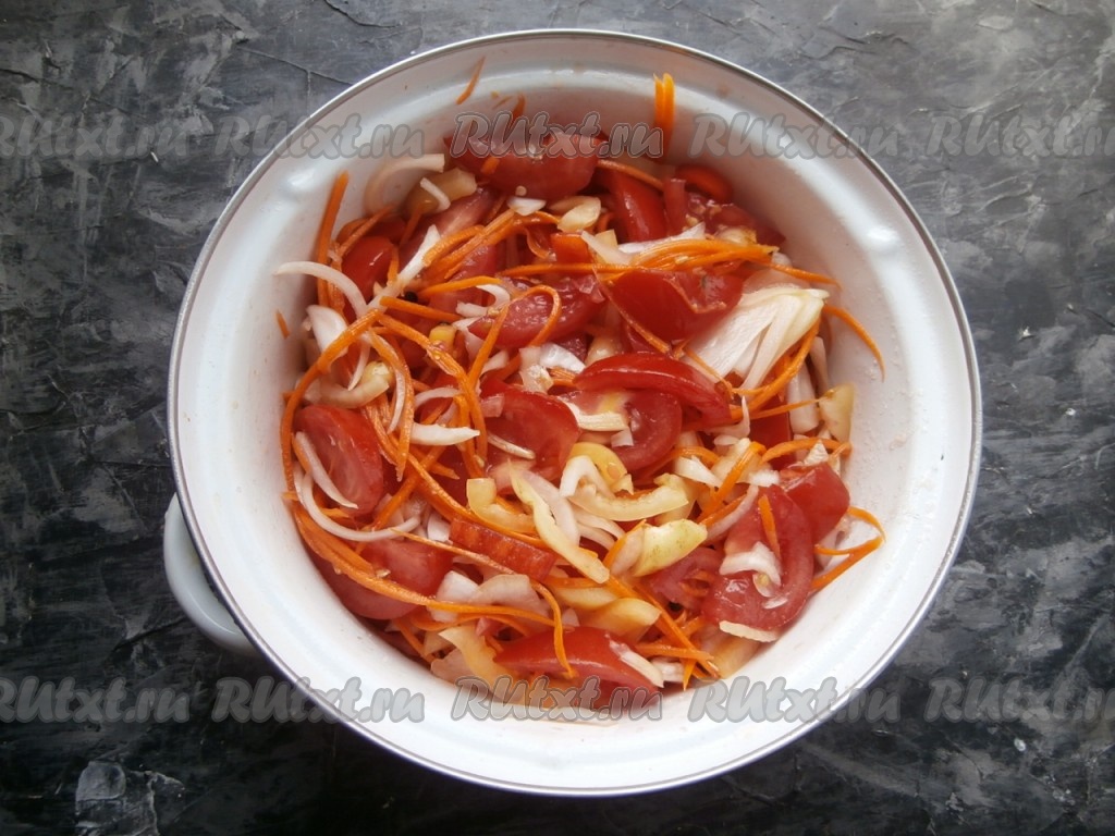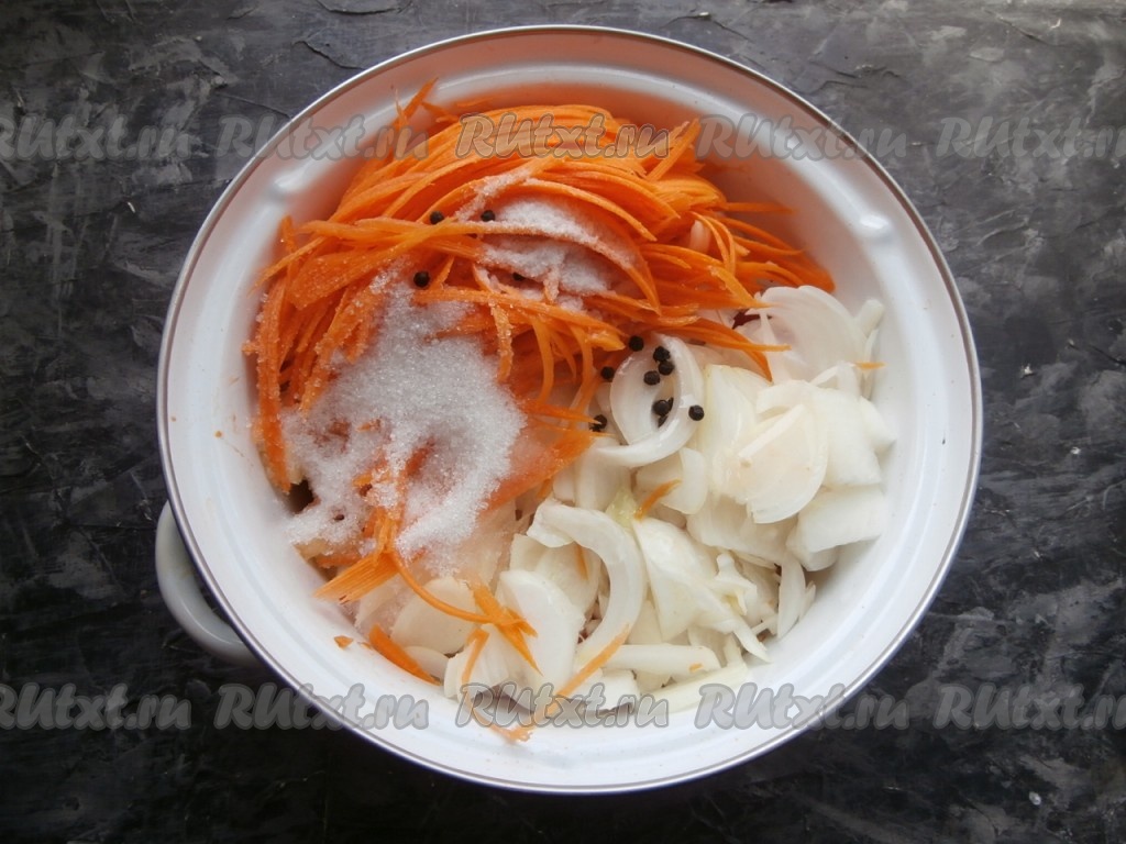 Сюда же добавить нарезанный полукольцами (или четвертинами) лук и натёртую на корейской тёрке морковь.