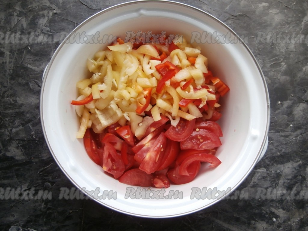 Помидоры нарезать дольками в кастрюлю, в которой будете готовить салат, добавить нарезанный соломкой болгарский перец.