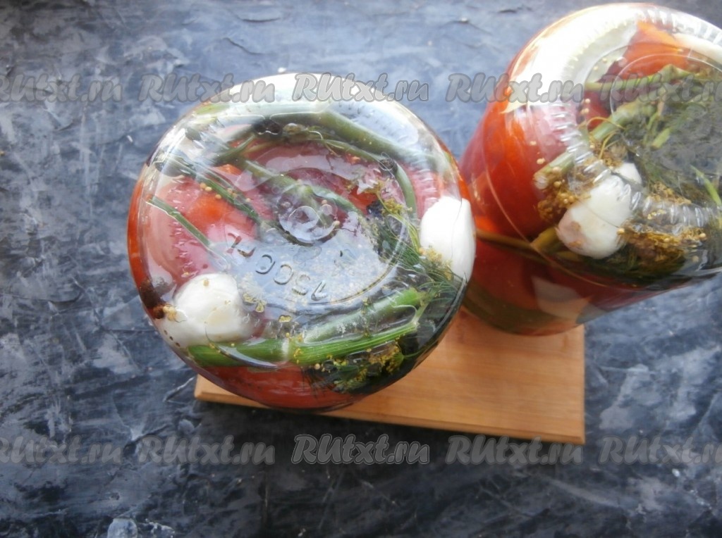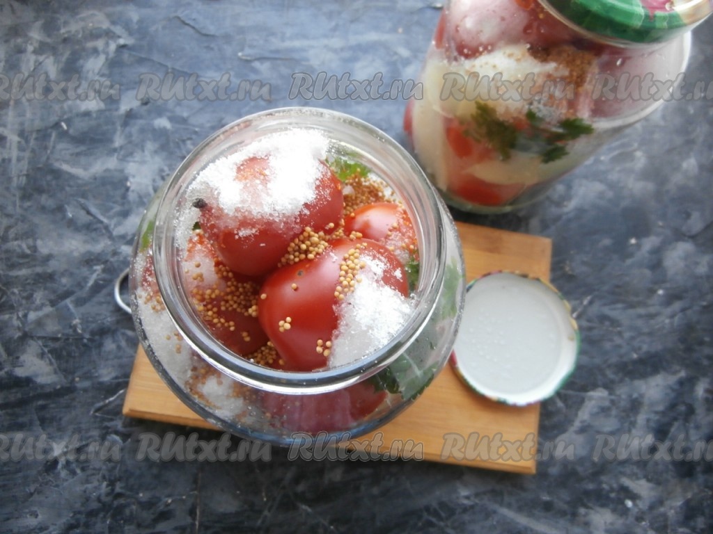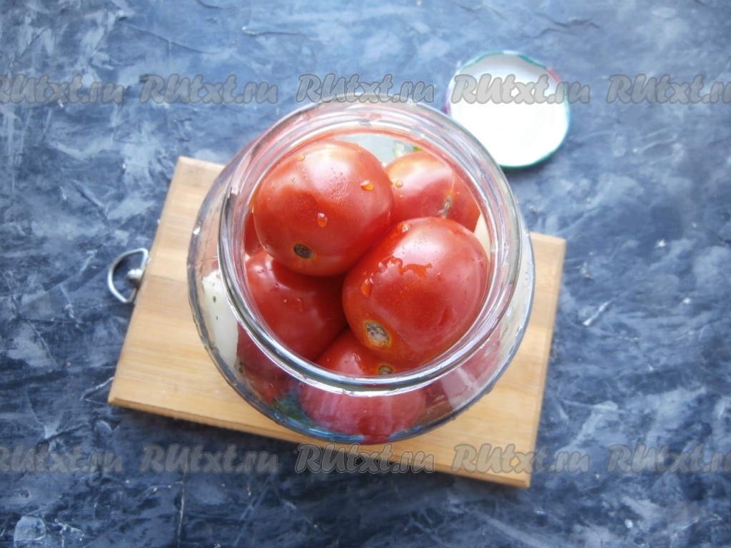 Залить помидоры кипятком так, чтобы вода немного выливалась через край и сразу банку закрутить крышкой, перевернуть. Банку нужно покрутить, чтобы сахар внутри растворился.