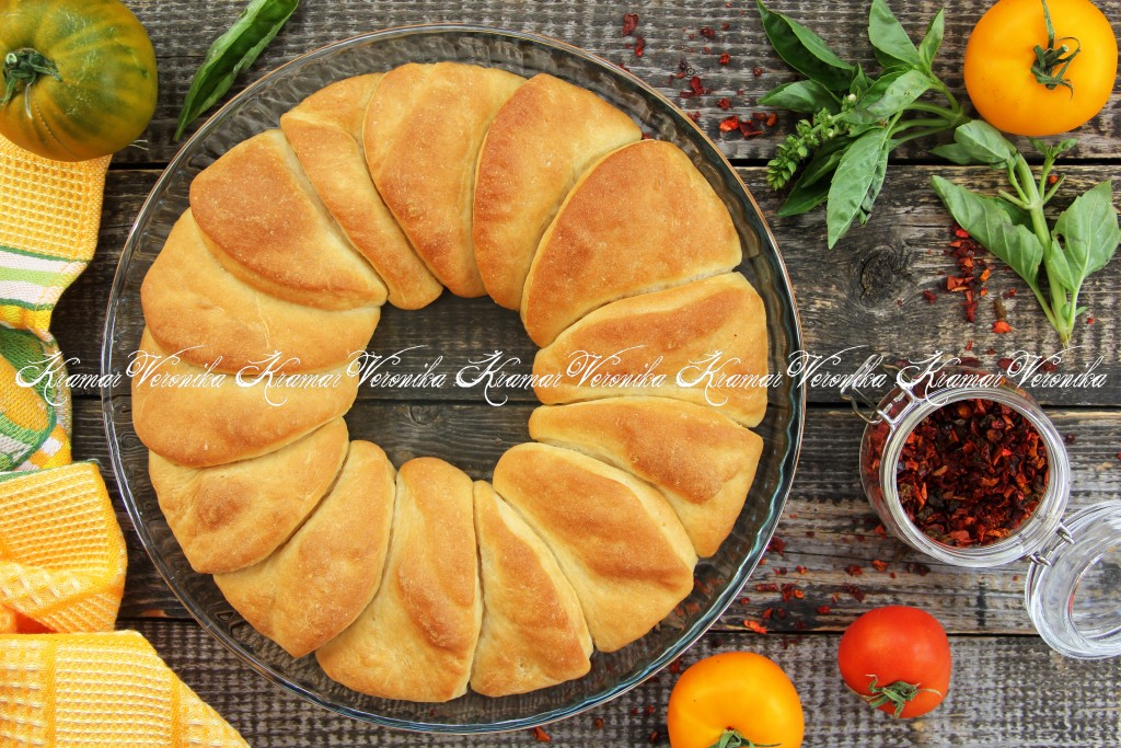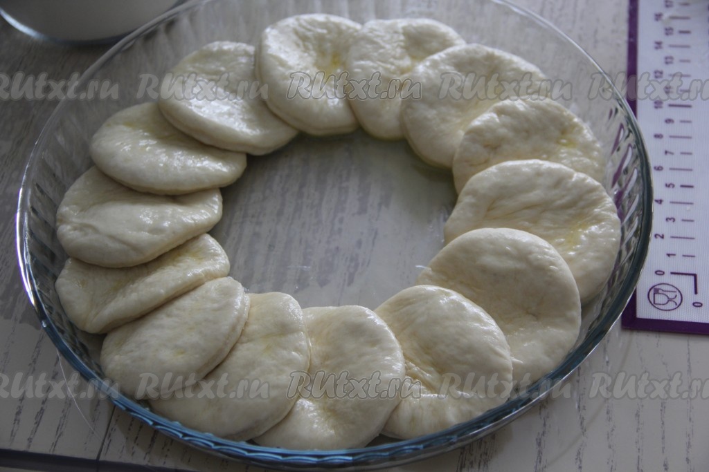 Каждый кружочек теста обмакнуть в растопленное сливочное масло и выложить внахлёст в круглую форму для выпечки (я использовала форму диаметром 28 см), оставить будущий хлеб для расстойки на 1 час.