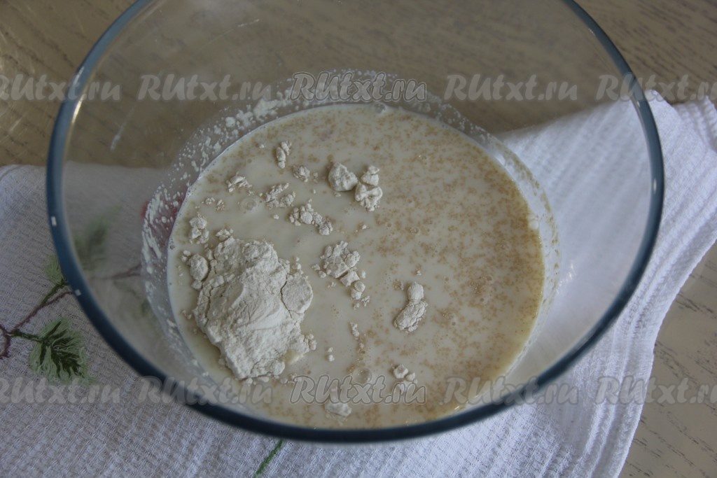 Молоко, подогретое до 38-40 градусов, вылить в миску, в которой удобно замешивать тесто, добавить сухие дрожжи, сахар и 2 чайные ложки муки, перемешать и оставить опару минут на 25.