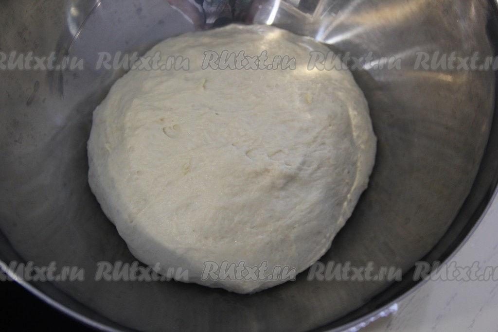 Хорошо вымесить тесто руками (до гладкого состояния), сформировать шар, выложить в миску, прикрыть полотенцем и оставить в тепле, примерно, на 1 час.