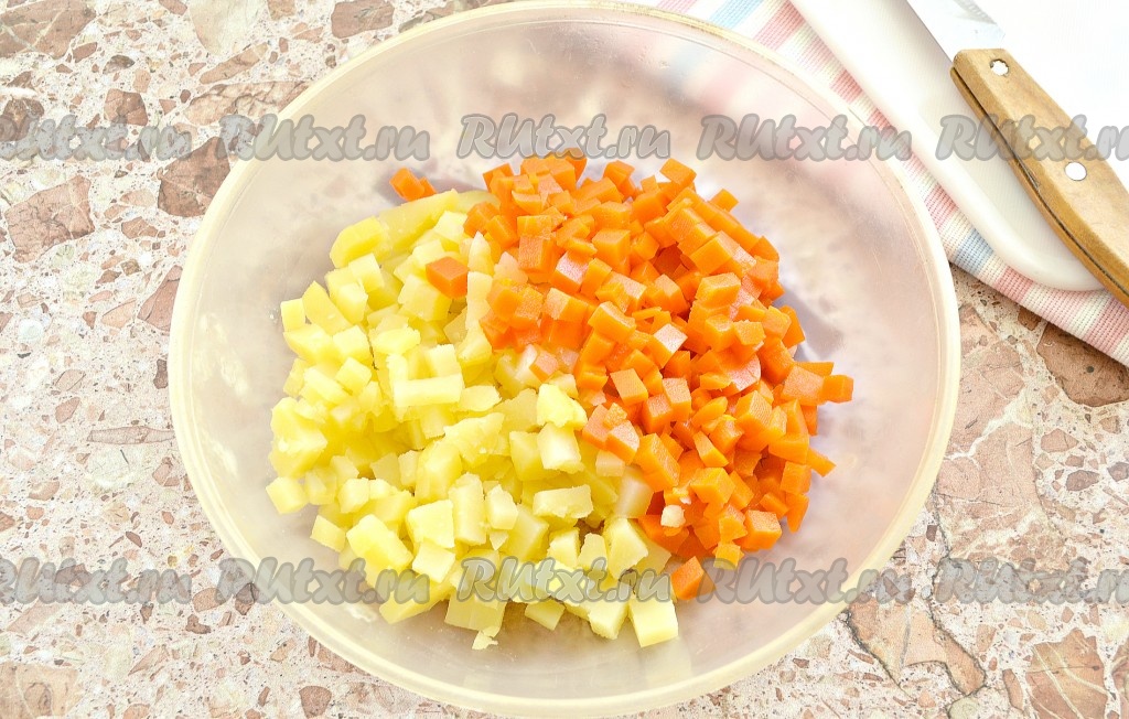 Заранее для салата отвариваем в кожуре картофель и морковь (на варку обычно требуется 20-25 минут, полностью готовые овощи должны легко прокалываться вилкой), корнеплоды остужаем и затем очищаем. Отвариваем куриные яйца вкрутую (варим 8-10 минут с начала закипания воды), остужаем их и очищаем. Ветчину выбирайте на свой вкус. Вместо укропа можно взять зелёный лук. Морковь и картофель нарезаем на мелкие кубики, выкладываем в достаточно объёмную миску. Нарезая ингредиенты для салата "Оливье", стараемся, чтобы все кубики были, примерно, одинакового размера.
