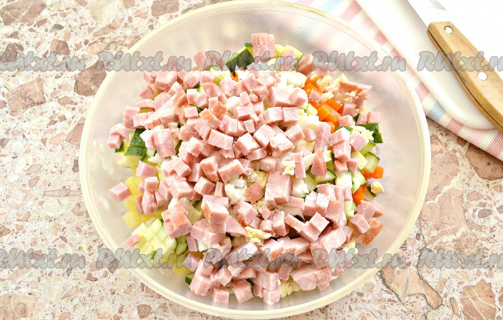 На мелкие кубики нарезаем и ветчину, перекладываем в миску.