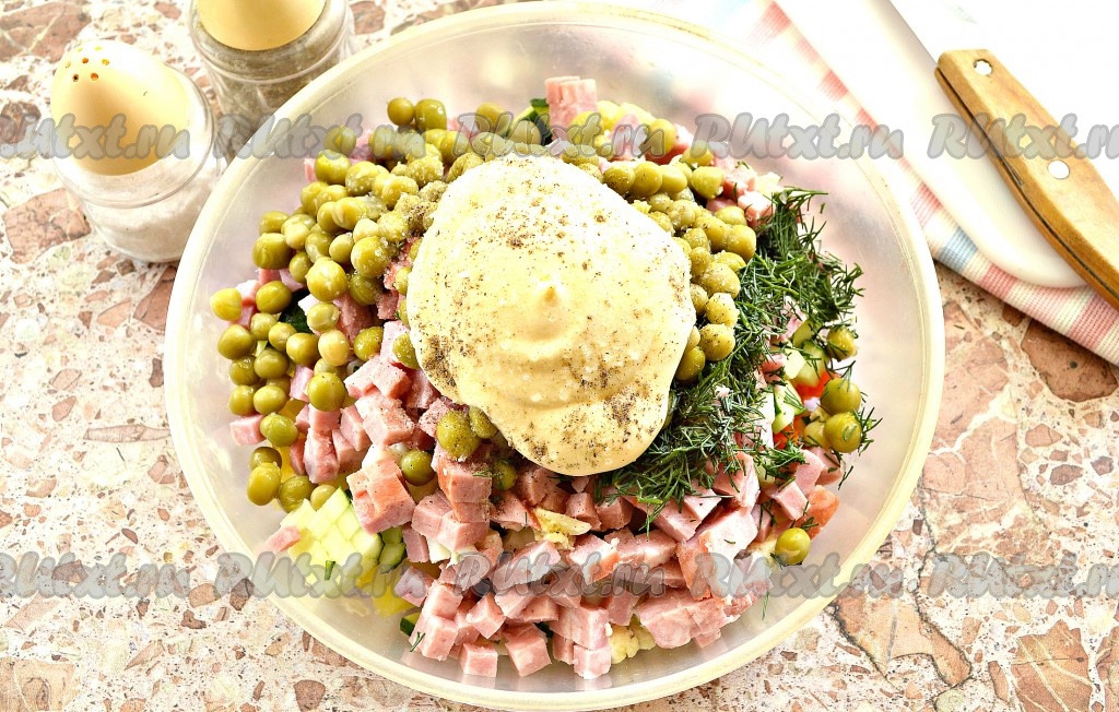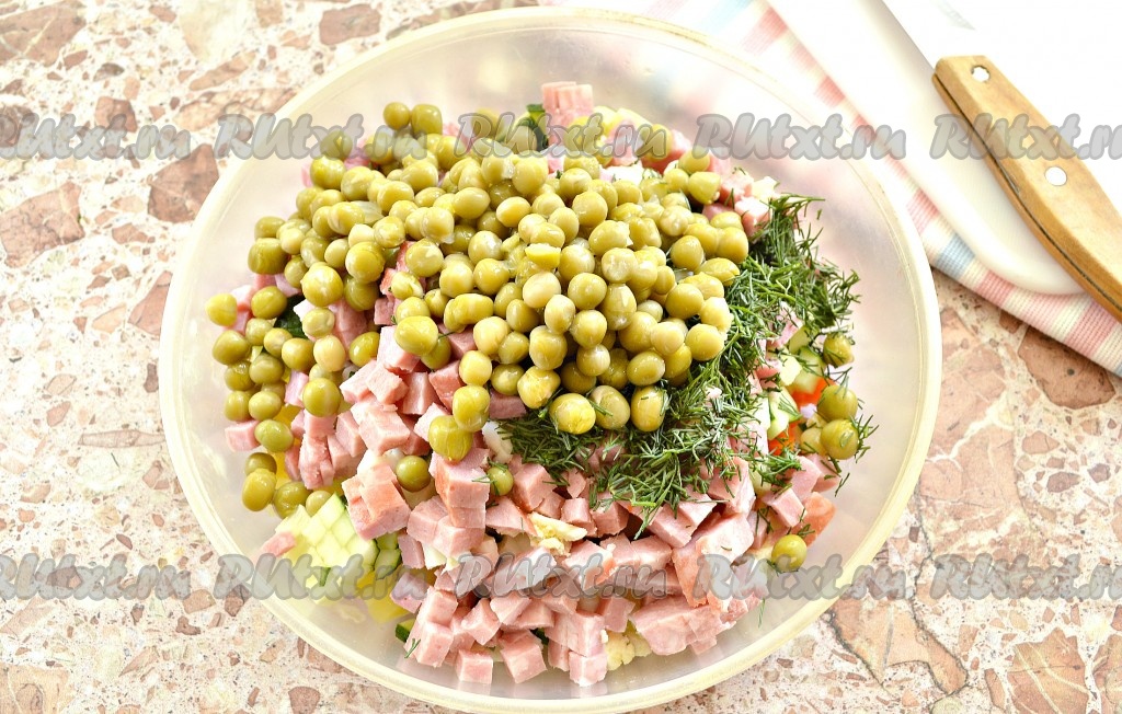 Зелёный горошек сначала откидываем на сито, чтобы убрать лишнюю жидкость, а потом перекладываем в миску с овощами и ветчиной. Сюда же добавляем и промытый, мелко нарезанный укроп.