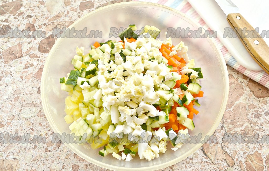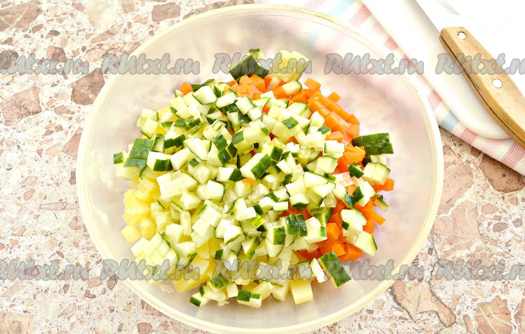 Тщательно промываем огурец, срезаем кончики и нарезаем на мелкие кубики (не забывайте, что кубики должны быть такого же размера, как мы нарезали картошку и морковку), выкладываем в миску с нарезанными овощами. Я нарезала огурец со шкуркой, но если она жестковата или горчит, то лучше её срезать.