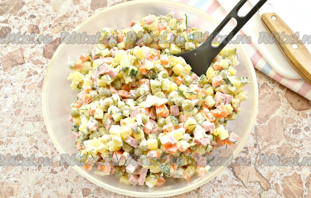 Осталось только ингредиенты перемешать и салат "Оливье" с ветчиной и свежим огурцом будет готов.