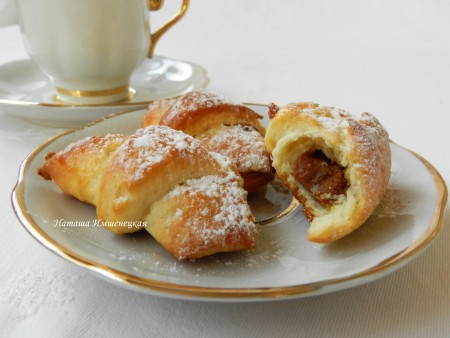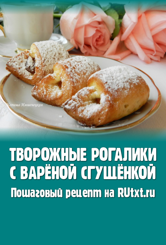 Мягкие, вкусные, аппетитные творожные рогалики с варёной сгущёнкой достать из духовки, дать остыть, присыпать, по желанию, сахарной пудрой и можно подавать к столу.