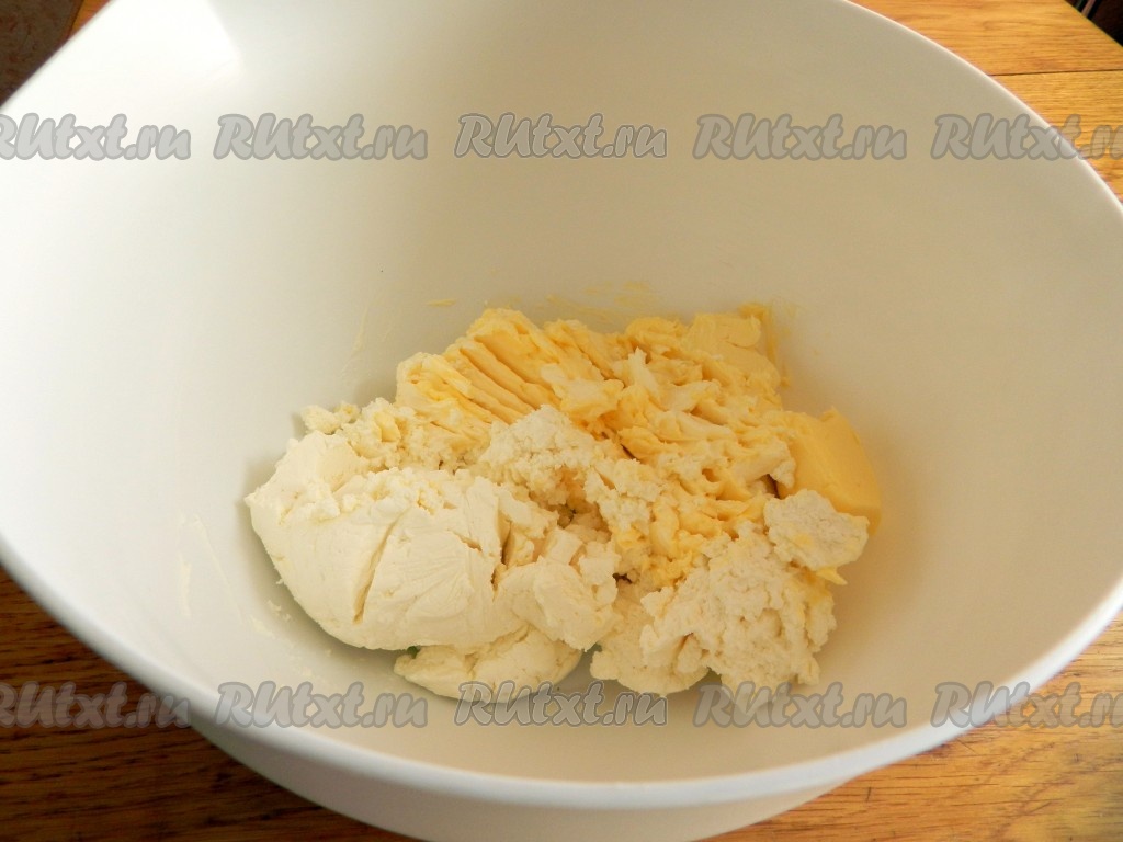 Сливочное масло должно быть комнатной температуры, поэтому его нужно достать из холодильника заблаговременно, чтобы оно согрелось и стало мягким. Выложить мягкое сливочное масло в миску, добавить творог, растереть вилкой до однородности (обращаю особое внимание, что не стоит перемешивать миксером).
