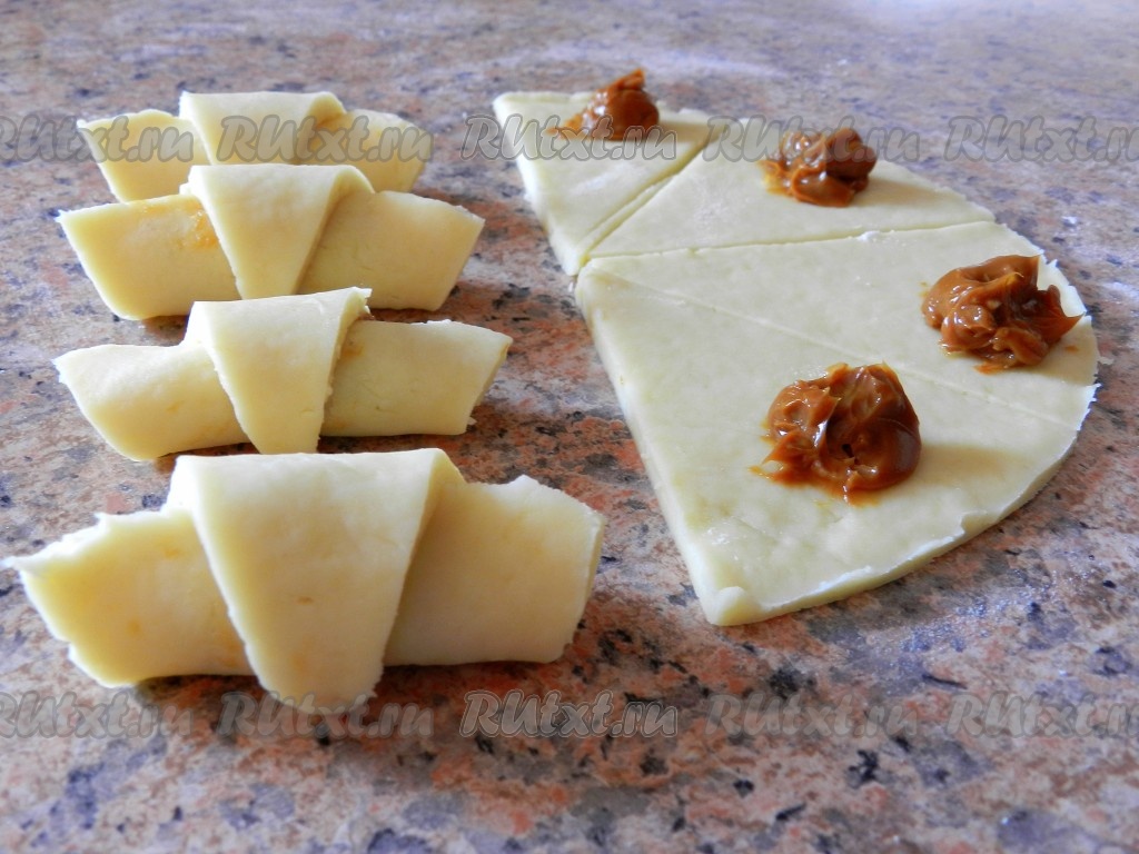 Ближе к основанию каждого сегмента, не забывая отступить от краёв, выложить по 1 чайной ложке варёной сгущёнки. Свернуть каждый сегмент, начиная со стороны с начинкой, в рулетик, формируя рогалик.
