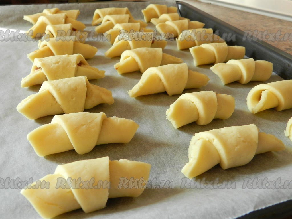Скрученные рогалики из творожного теста выкладывать на противень, застеленный пергаментом. Яйцо слегка взбить вилкой, смазать поверхность рогаликов. Выпекать рогалики в духовке, разогретой до 190 градусов, 20 минут. Из указанного количества ингредиентов получается 32-34 рогалика.