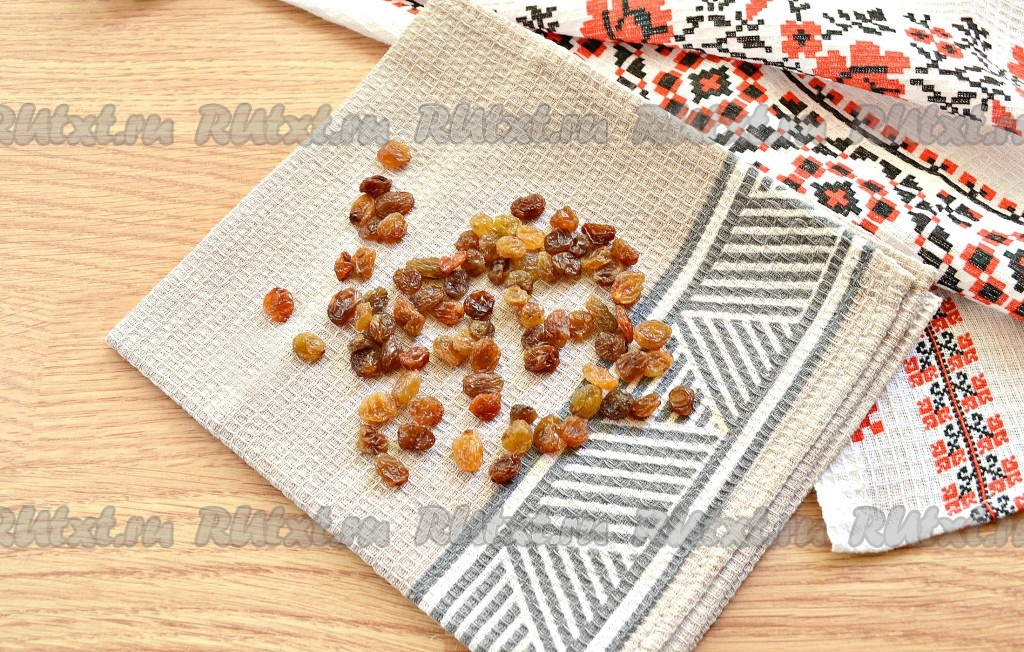 Рекомендую перед приготовлением теста заранее достать из холодильника сметану и яйцо, чтобы ингредиенты стали комнатной температуры. Изюм перебираем, он должен быть без косточек и хвостиков. Заливаем горсть изюма кипятком и оставляем на 10 минут, затем промываем, воду сливаем и обсушиваем на тканевом полотенце.