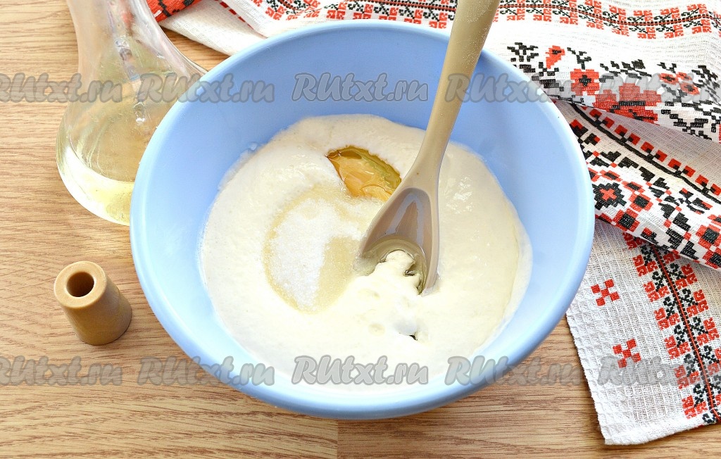 Затем в смесь сметаны и соды добавляем 2 столовые ложки растительного масла, сахар, соль и яйцо.