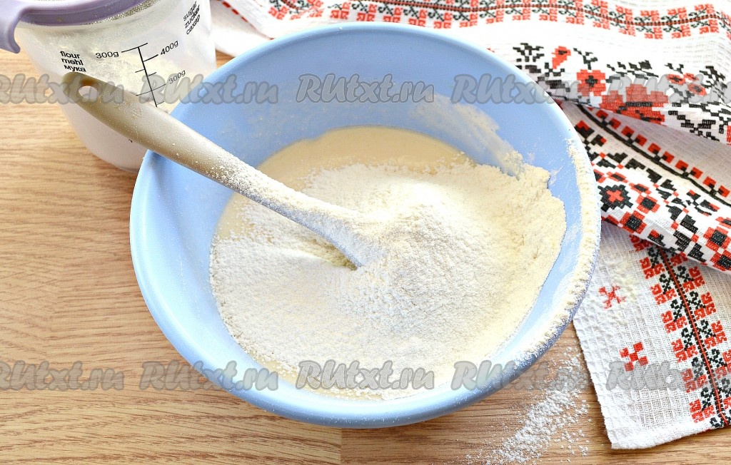 В эту смесь добавляем в 2-3 захода просеянную муку, каждый раз перемешивая до однородности.