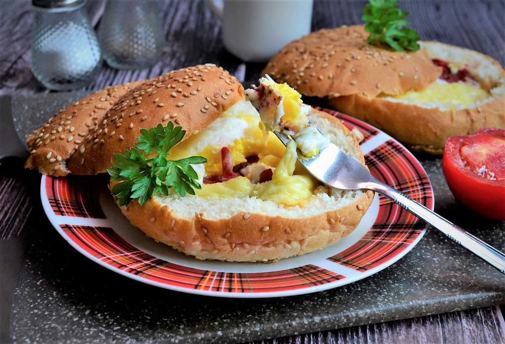 Готово! Вкуснейшие булочки с яйцом можно доставать из микроволновки и подавать к столу в горячем виде.