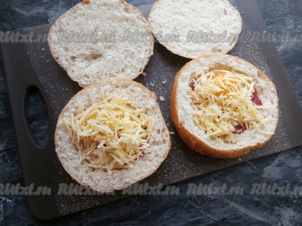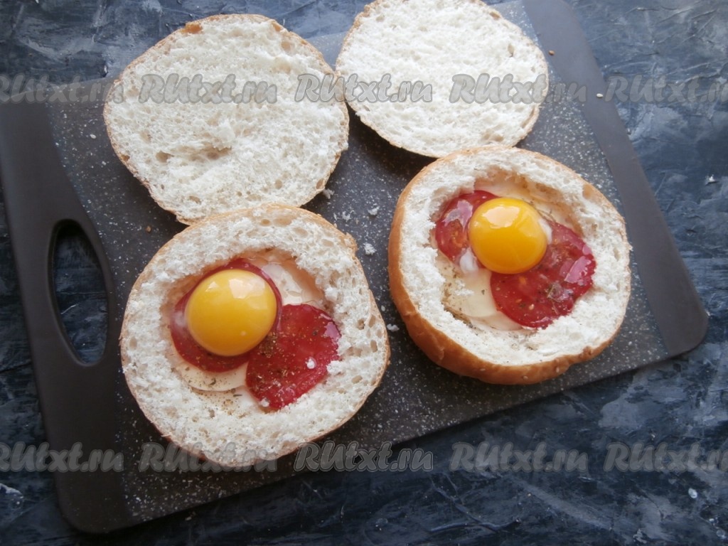 Аккуратно разбить по одному яйцу в каждую булочку, не повредив желток.