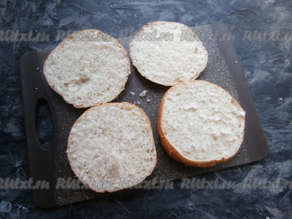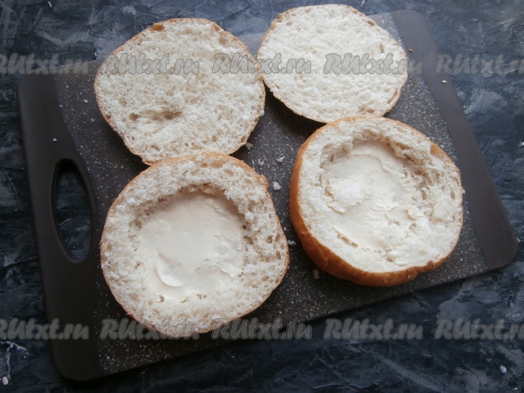 Смазать дно булочек пастообразным плавленым сыром (или майонезом).