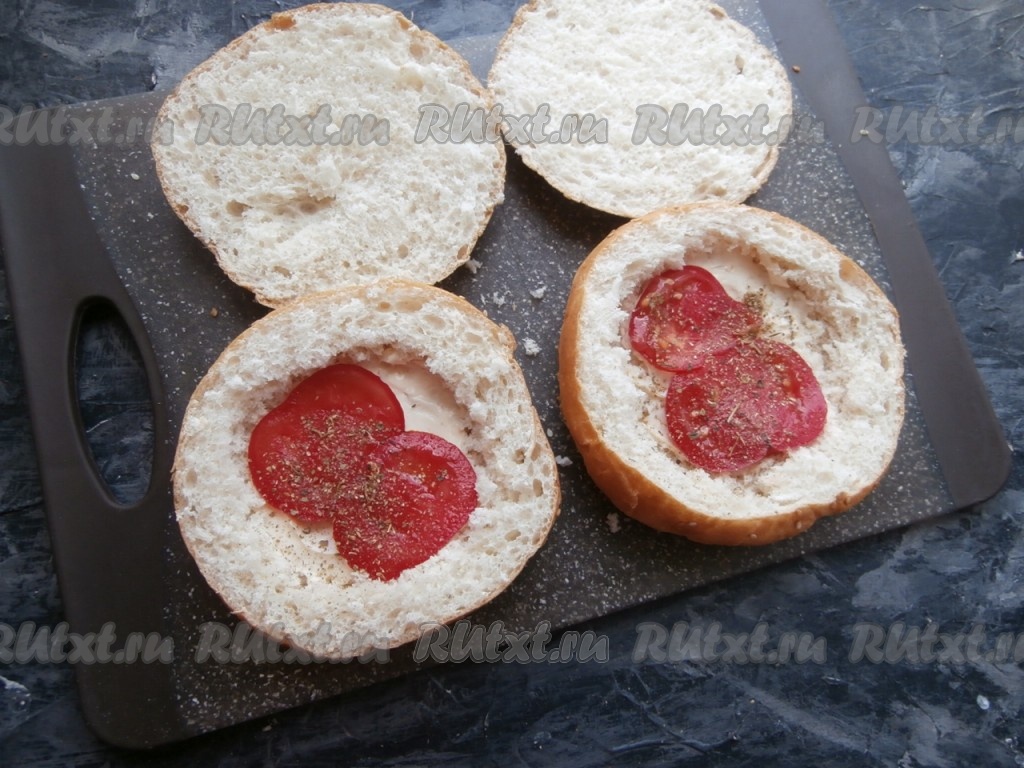 Поверх сыра (или майонеза) выложить по 2 тонких кружочка свежего помидора, чуть посыпать солью, молотым перцем и сухими травами (или вашими любимыми специями).