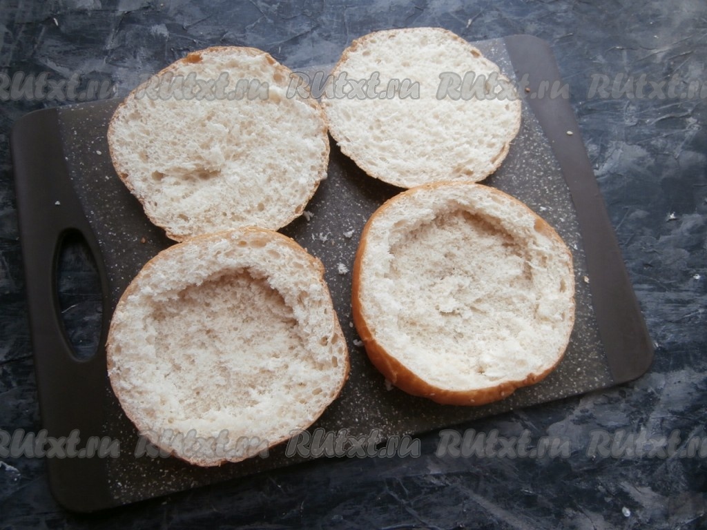 "Крышечки" отложить в сторону, а из основания булочек вынуть мякиш (вынутый мякиш в этом рецепте нам не понадобится, его можно использовать, например, для приготовления котлет).