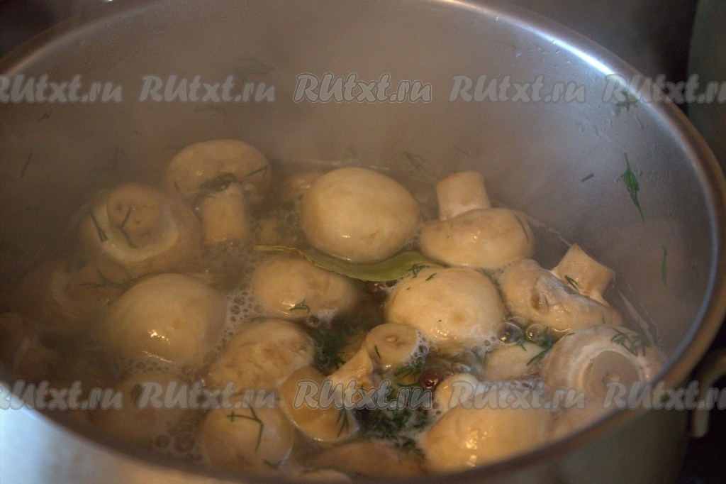 Затем в кастрюлю с рассолом выложить шампиньоны с чесноком, укропом и специями, довести до кипения, а после этого проварить на среднем огне 3-5 минут, помешивая.